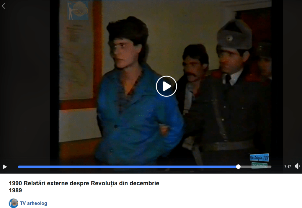 2) Terrorist suspects in custody at the IGM HQ either 27 or 28 decembrie 1989, unfortunately the original French reportage (correspondent Jerome Cathala) is not available, although it is replayed with original sound here. Minister of the Interior Mihai Chitac is seen upon entry to film the captured terrorists. The viewer can tell not all may be Romanian. Unfortunately, the pictures are obscured by all the writing. Viewing starts from approx. min. 45:00. The commentary by Grigore Cartianu (“vuvuzela securistului patriot”), Alex Mihai Stoenescu (informator securist), Ioan Talpes (fost sef SIE si mai mult), and Radu “Nasu” Moraru, is painfully stupid and full of disinformation. Per Cartianu and Moraru, these captured “terrorists” would have been Soviet agents (“tourists”) whose passports were still at the Soviet Embassy and Tiajelnikov etc. would have had to go there to get them in order to repatriate the “terrorists”…