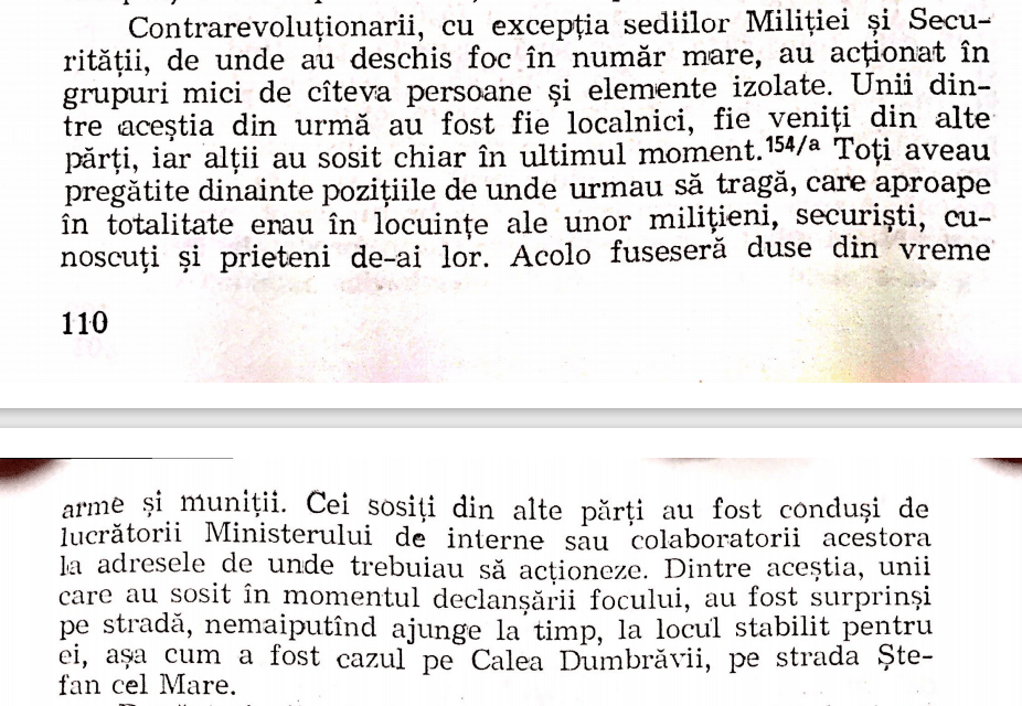 Abrudan on pages 9 and 110 again discusses the presumed goals of the terrorists. There is little doubt from reading the testimonies and accounts of this book, taken in the first six months after December 1989, as to the former Securitate and Militia being the primary source of the counterrevolutionary terrorism.
