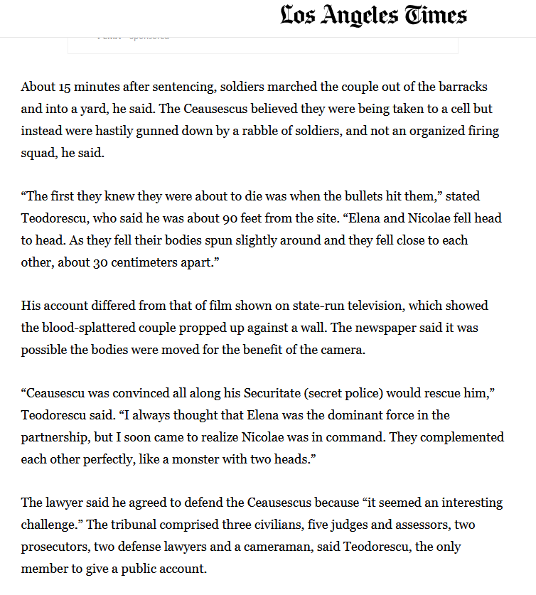 And a month after the trial and execution of the Ceausescus, the Ceausescus’ lawyer, Nicu Teodorescu, had stated: