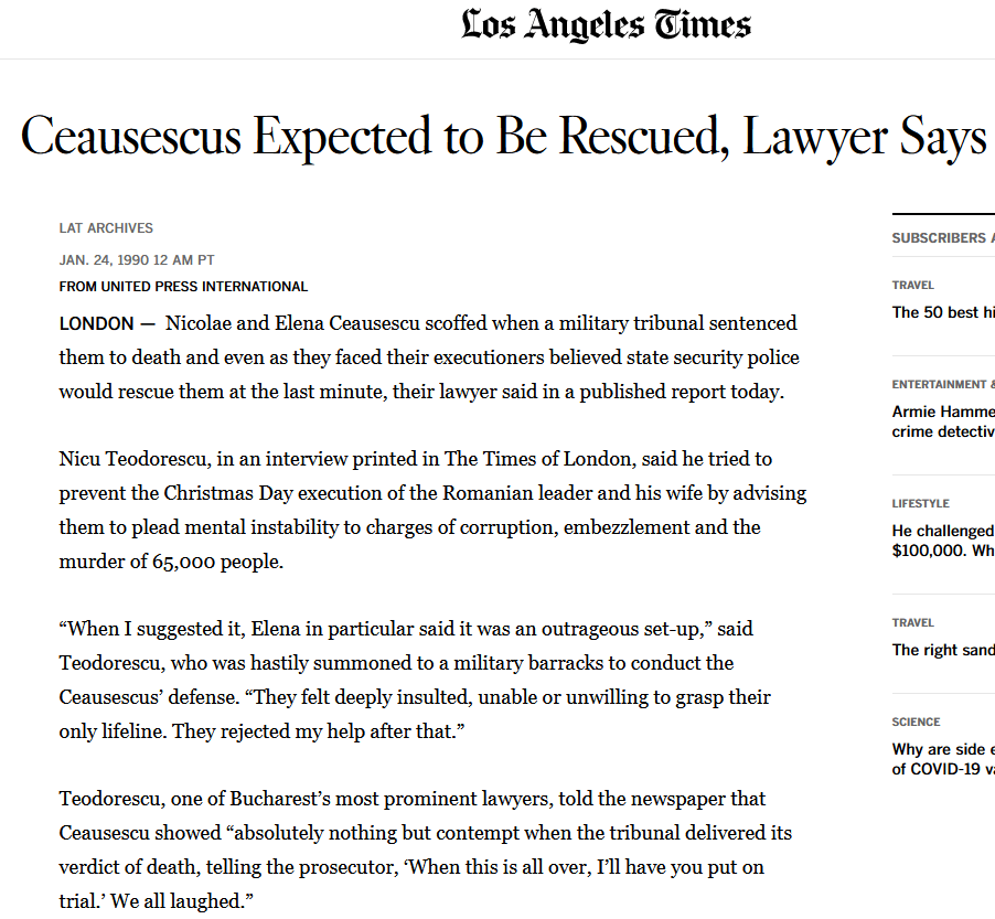 “Ceausescu was convinced all along his Securitate would rescue him. He never thought the trial would end, and when it ended be showed absolutely nothing but contempt when death was pronounced,” Teodorescu says. https://archive.org/stream/NewsUK1990UKEnglish/Jan%2024%201990%2C%20The%20Times%2C%20%2363611%2C%20UK%20%28en%29_djvu.txt THE TIMES WEDNESDAY JANUARY 24 1990