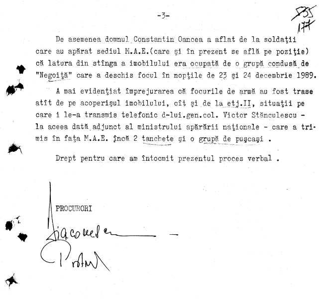 10) Oancea says he then found out from soliders defending the Foreign Ministry building (and who as of the date of this declaration were still there) that those from the left side of building who opened fire on the nights of 23 and 24 December 1989 were commanded by a certain “Negoita.” The circumstances of the gunfire from the rooftop of the building as well as from the second floor (European) were transmitted to Gen. Col. Victor Stanculescu who at that time was Deputy Defense Minister and who as a result sent an additional two tanks and a team of riflemen to the Foreign Ministry.