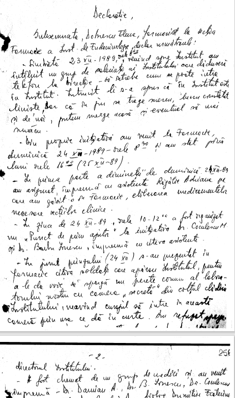 As I have said previously, many declarations in the Revolution Files contain their own mini-histories, their own drama and struggles. Below (and please correct by transcription errors!), the 12 January 1990 declaration of pharmacist Elena Dobrescu from the Parhon Institute. Those who had stuff to hide and forget did not await some political order from on high…they were covering up almost immediately after the failed counter-revolution that followed 22 December 1989…protecting themselves and others, more powerful and less forgiving than them. Reader’s insights as always welcome and appreciated here.