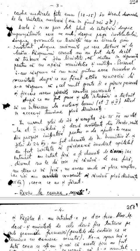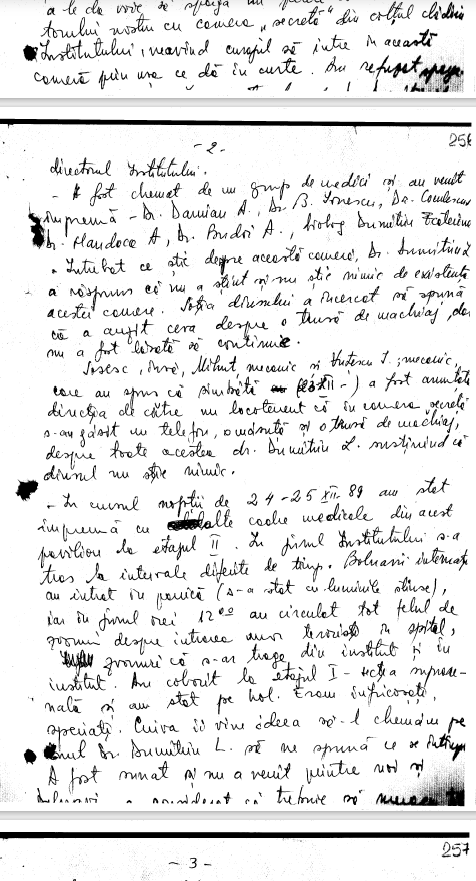 A fost chemat de un grup de medici si au venit impreuna–Dr. Damian A., Dr. B. Ionescu, Dr. Conderescu(?), Dr. Mandace A, Dr. Pondri A., biolog Dumitru Ecaterina. Intrebat ce stie despre aceasta camera Dr. Dumitriu [dr. Leonard Dumitriu, directorul Institutului] a raspuns ca nu a stiut si nu stie nimic de existenta acestei camere. Sotia dinsului a incercat sa spuna ca a auzit ceva despre o trusa de machiaj, dar nu a fost lasata sa continuie…