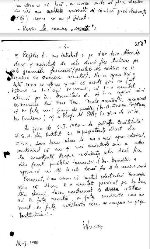 In ziua de 9-I-1990–la sedinta comitetului F.S.N. din Institut cu reprezentati direct din FSN, dna farm Alexe M. nu a mai spus adevrarul sustinind ca nu-si mai amineste cui a adus la cunostinta despre existenta celor doua fire din jurul peretului farmaciei. Dr. Dumitriu a spus ca nu stie de cele doua fire de la camera secreta. Personal, i-am spus ca restul colectivului Farmaciei stim ca dinsa l-a anuntat personal pe Dr. Dumitriu atunci, lucru confirmat de atitea ori in fata noastra, in fata medicilor care au venit, in fata militarilor care se ocupa cu paza Institutului.