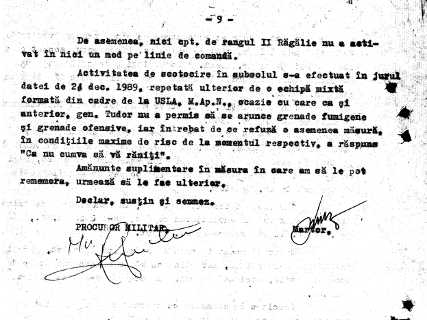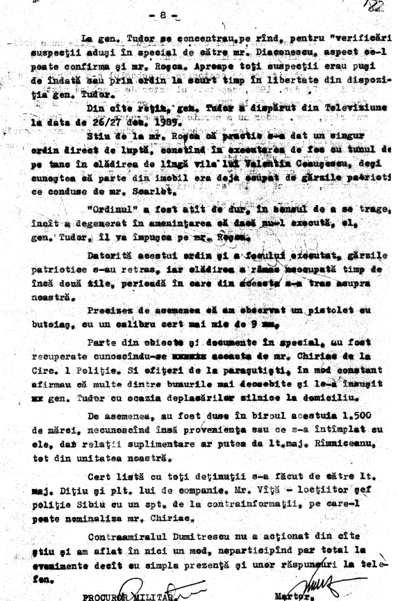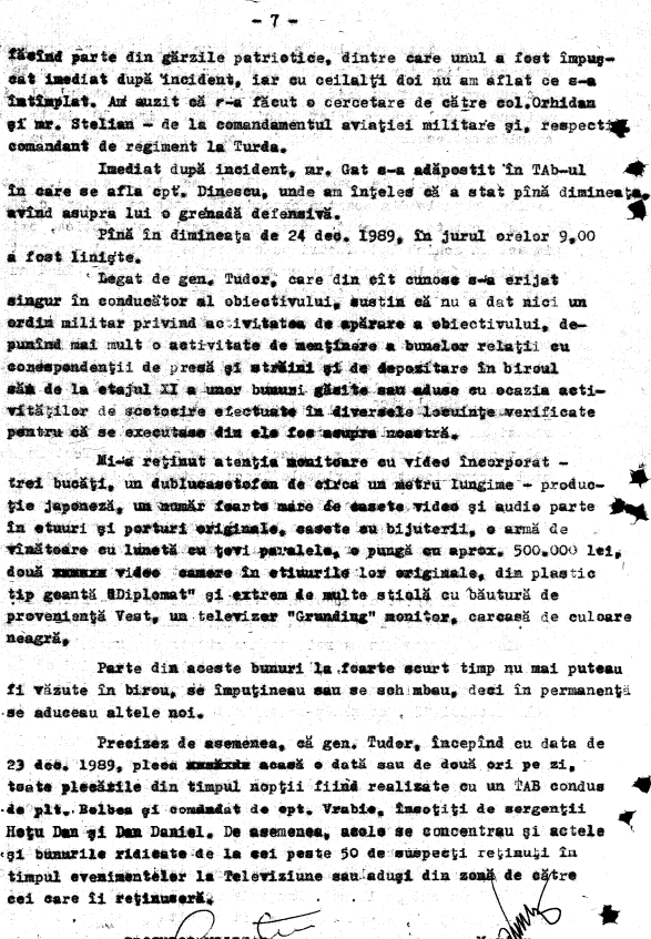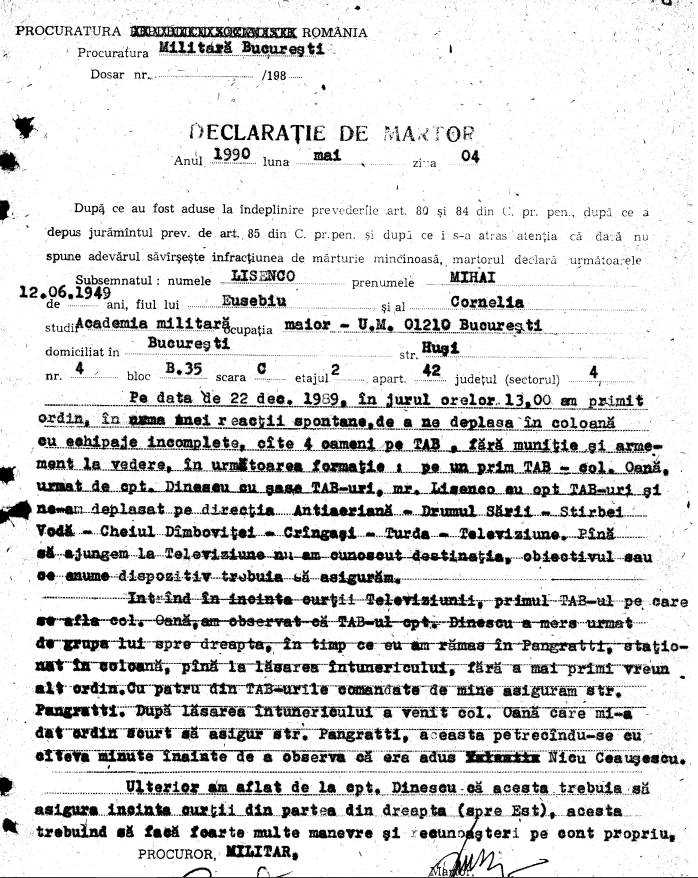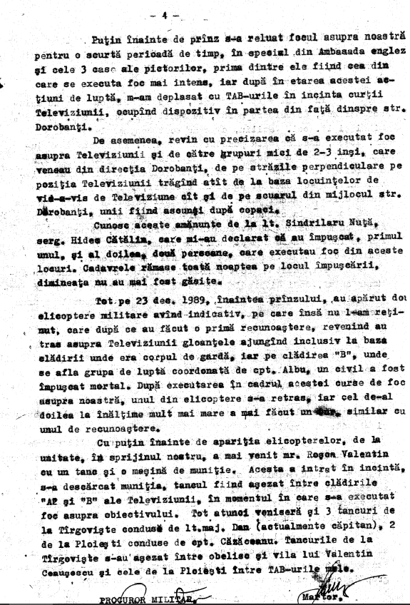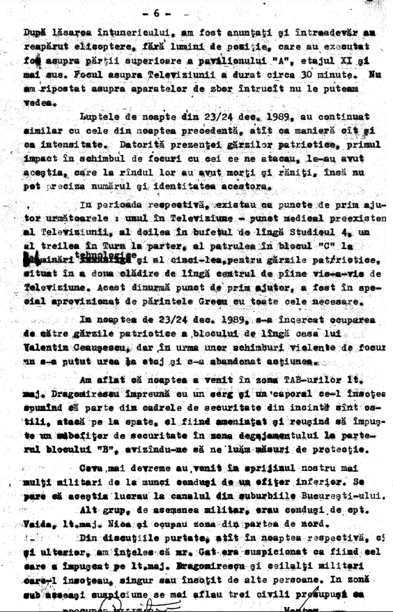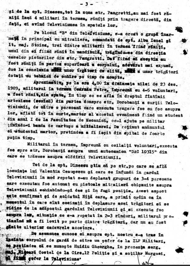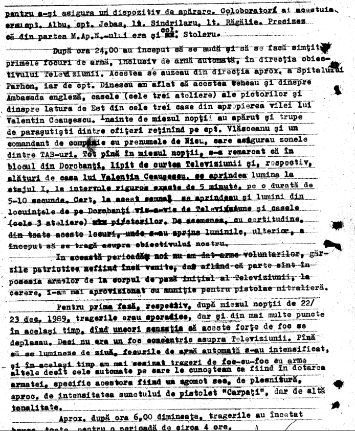 Dupa ora 24,00 [22/23] au inceput sa se auda si sa se faca simtit primele focuri de arma, inclusiv de arma automata, in directia obiectului Televiziunii. Acestea se auzeau din directia aprox. a Spitalului Parhon, iar de cpt. am aflat ca acestea veneau si dinspre Ambasada engleza, casele (cele trei ateliere) ale pictorilor si dinspre latura de Est din cele trei case din aproprierea vilei lui Valentin Ceausescu….Tot pina in miezul noptii, s-a remarcat ca in blocul din Dorobanti, lipit de curtea Televiziunii si, respectiv, alaturi de casa lui Valentin Ceausescu, se aprindea lumina la etajul 1, la intervale riguros exacte de 5 minute, pe o durata de 5-10 secunde. Cert, la acest semnal se aprindeau si lumini din locuintele de pe Dorobanti vis-a-vis de Televiziune si casele (cele 3 ateliere) pictorilor. De asemenea, cu certitudine, din toate aceste locuri, unde s-au aprins luminile, ulterior, a inceput sa se traga asupra obiectivului nostru.