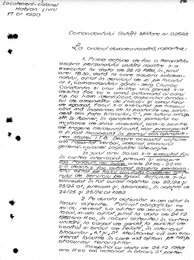 Prima actiune de foc a teroristilor asupra personalului unitatii noastre s-a executat la data de 22.12.1989, in jurul orei 18:30…s-a deschis foc cu arma automata al carui tip nu l-am identificat, dispunind probabil de ascunzator de flacari si amortizor de zgomot…