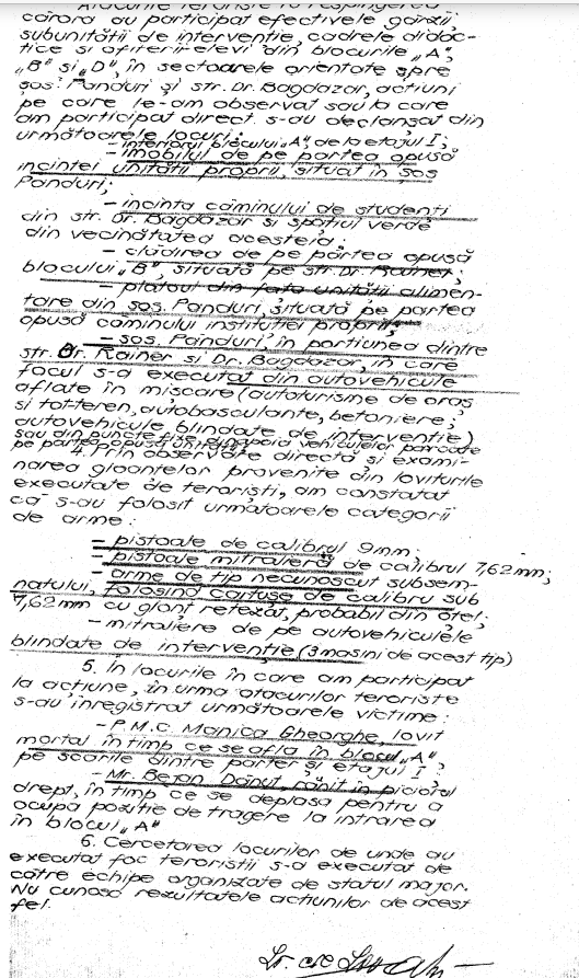Prin observare directa si examinarea gloantelor provenite din loviturile executate de teroristi, am constatat ca s-au folosit…pistoale de calibrul 9 mm, pistoale mitraliera de calibrul 7,62 mm; arme de tip necunoscut subsemnatului, folosind cartuse de calibru sub 7,62 cu glont retezat, probabil din otel; mitraliere de pe autovehiculele blindate de interventie (3 masini de acest tip) [nota–deci ale uslasilor…]