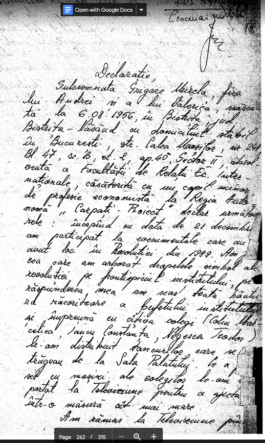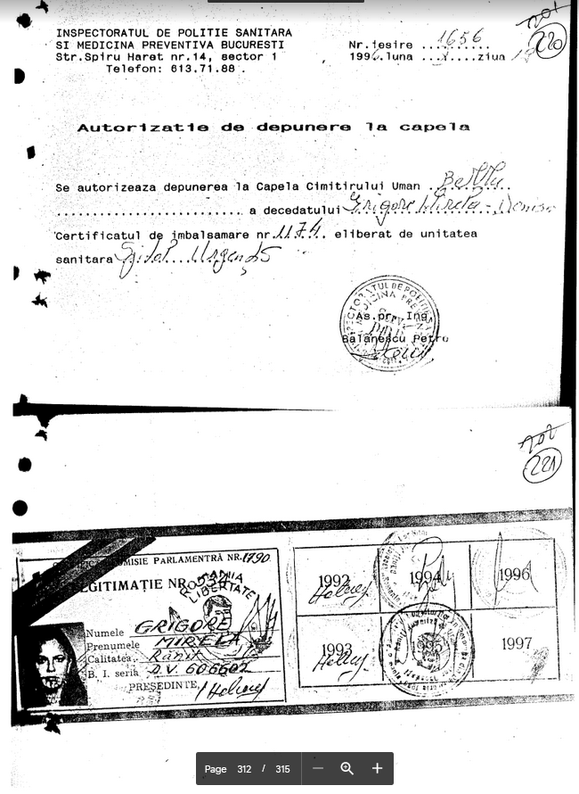 Mirela mi-a spus ca in aceea zona se schimbau focuri de arma, tragandu-se de pe acoperisul Cercului Militar National si din directia Militiei Capitale. Fiica mea a fost atinsa de un singur glont despre care Mirela mi-a zis ca ar fi fost tip “dum-dum”…ca urmare a complicatelor secvente provocate de plaga impuscata GRIGORE MIRELA a decedat….