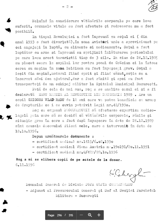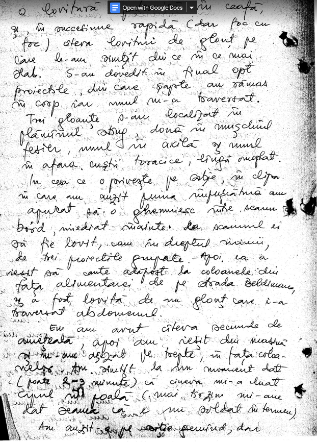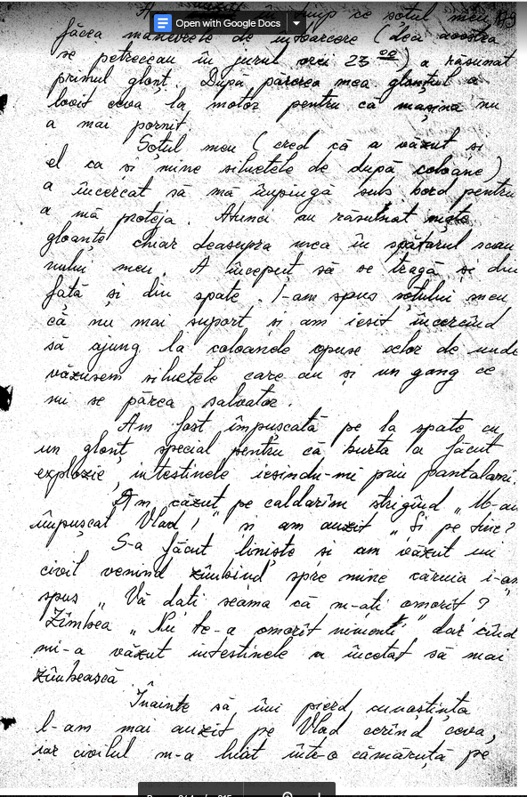 Am fost impuscata pe la spate cu un glont special pentru ca burta a facut explozie, intestinele iesindu-mi prin pantaloni….ca prin ceata am vazut un militian dar nu de circulatie.
