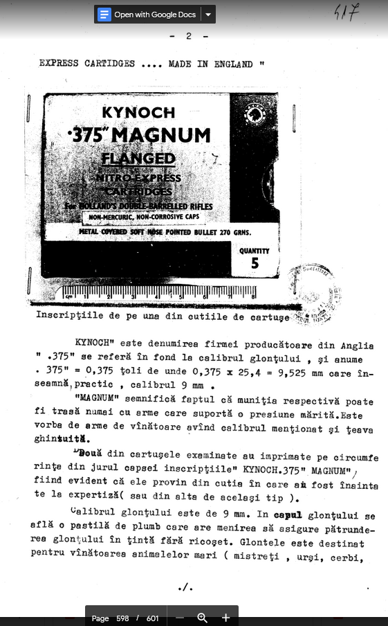 Cartuse de tip “Kynoch-Magnum” s-au gasit la Buzau, dar si in zona Televiziunii si se pare ca o “mostra” a mai fost depistata si in zona fostului c.c. Este produs de firma “Kyondi”, celalalt cuvint “Magnum” fiind o unitate de masura. Acest cartus are calibrul 9,5 mm sau 0,375 toli. Este un cartus de vinatoare pentru vinat mare si poate fi tras cu orice tip de carabina sau puscaa de calibru 9,5 care are o camera destinata unui astfel de gen de incarcatura. Este un cartus de mare putere, caracteristicele lui permitind ca un bun tintas sa loveasca perfect si mortal la o distanta de 1000 m, viteza initiala a glontului este de circa 850 m/s. Pulberea din cartus este, intr-adevar mai neobisnuita, dar deloc noua, avind in vedere ca se fabrica din anii 70. Este vorba de o pulbere sub forma de…macaroane, cu ardere constanta, care imprima glontului o viteza marita, determinind si o mica uzura a tevii. “Macaroanele” sint facute din nitroceluloza plastificata cu nitroglicerina. Glontul este de tip “Softnosed”, ceea ce in traducere ar insemna, “cu nasul moale”, adica la impactul cu tinta, virful glontului se deformeaza radial, ceea ce determina producerea de rani grave la intrare. Nu este un glont penetrant raminind pe loc, dar provocind o lovitura de categoric mortala. Glontul este un miez de plumb acoperit intr-o camasa de tombac, un aliaj pe baza de cupru.