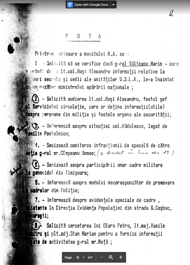 Once again, as in other cases (Marian Romanescu, Constantin Cirjan, etc.), if the terrorists did not exist, as the Rechizitoriu from April 2019 maintains and as so many former Securitate today maintain, or the terrorists existed but were most definitely not Securitate personnel (i.e. the Army itself, DIA, Soviets, Hungarians, etc.), then how is it possible that a Militia chief could present a Securitate officer who knows the secret plans of the U.S.L.A. and different details about “nests” of them. Cuiburi (“nests”) is a clear reference to “cuiburi de teroristi”…the places from where the counter-revolutionary forces still loyal to Nicolae Ceausescu and his communist regime fired and created such mayhem and death? The answer: the U.S.L.A. supplied at least some of the Securitate’s counter-revolutionary forces.