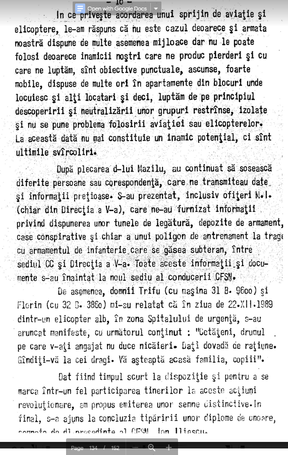 “S-au prezentat, inclusiv ofiteri M.I. (chiar din Directia a V-a), care ne-au furnizat informatii privind dispunerea unor tunele de legatura, depozite de armament, case conspirative si chiar a unui poligon de antrenament la tragere cu armamentul de infranterie care se gasea subteran, intre sediul CC si Directia a V-a.”