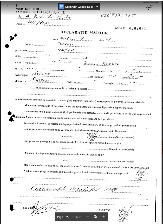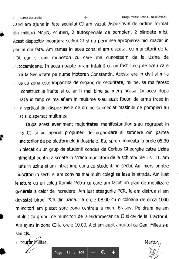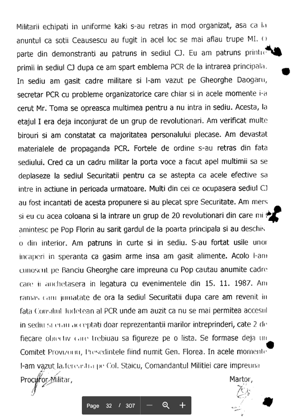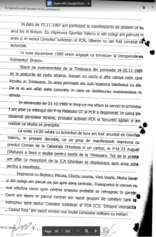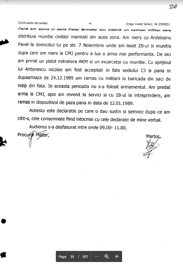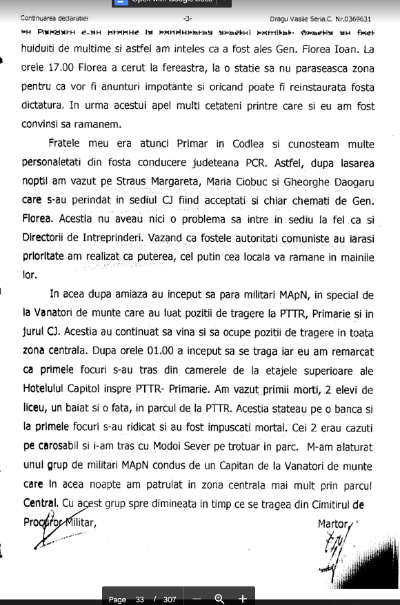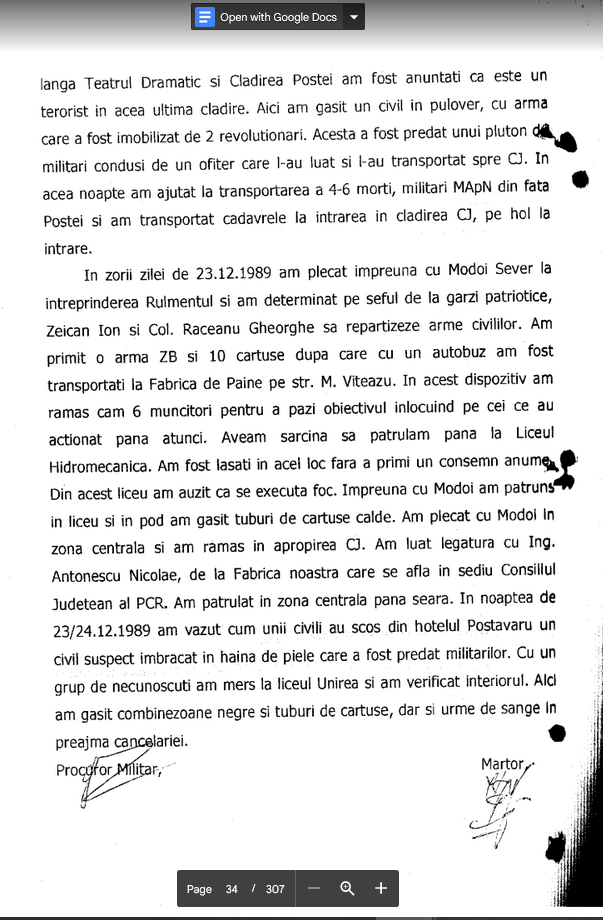 “…In acea noapte [21.12.1989] m-am intilnit cu un fost coleg de liceu care lucra la Securitate pe nume Motoran Constantin. Acesta era in civil si mi-a spus ca zona este impanzita de organele de securitate, militie, sa ma feresc [de] constructiile inalte si ca ar fi mai bine sa merg acasa…In noaptea de 23/24.12.89…cu un grup de necunoscuti am mers la liceul Unirea si am verificat interiorul. Aici am gasit combinezoane negre si tuburi de cartuse, dar si urme de sange in preajma canceleriei.”