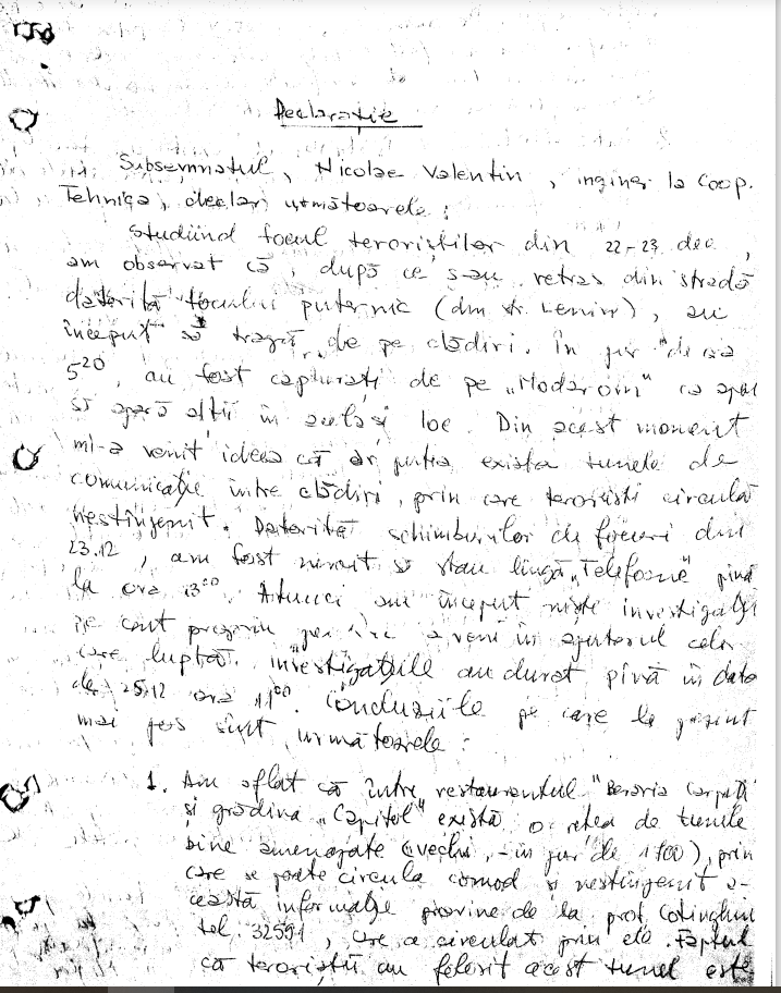 Studiind focul teroristilor din 22-23 dec. am observant ca, dup ace s-au retras din strada datorita focului puternic (din str. Lenin) au inceput sat raga de pe cladiri. In jur de ora 5.20 au fost capturati de pe “Modarom” ca apoi sa apara altii in acelasi loc. Din acest moment mi-a venit ideea ca ar putea exista tunele de comunicatie intre cladiri prin care teroristii circula nestingherit. Datorita schimburilor de focuri din 23.12 am fost nevoit sa stau langa “Telefoane” pana la ora 13. Atunci am inceput niste investigatii pe cont propriu pentru a veni in ajutorul celor care lupta. Investigatiile au durat pana pe data de 25.12 ora 11. Concluziile pe care le prezint sunt urmatoarele: