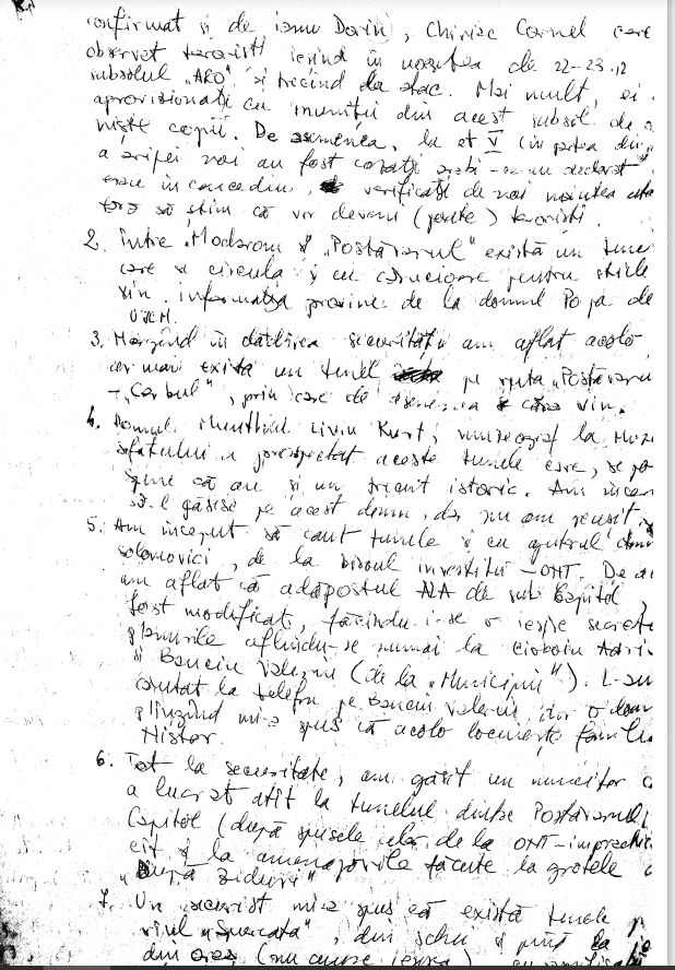 5.Am inceput sa caut tunele si cu ajutorul domnului Solemovici (?), de la biroul investitii ONT. De acolo am aflat ca adapostul ALA de sub Capitol a fost modificat, facandu-i-se o iesire secreta, planurile aflandu-se numai la Ciocoiu Adrian si Banciu Valentin (de la “Municipiu”). L-am cautat la telefon pe Banciu Valentin dar o doamna, plangand, mi-a spus ca acolo locuieste familia Nistor.
