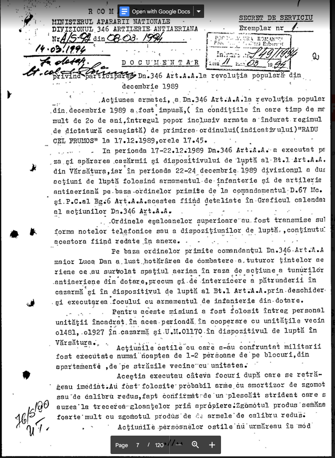 Dosarul Revolutiei. The Past is Coming (104). Documentar Dn. 346 Art. A.A. (Braila, 08.03.1994): “Actiunile persoanelor ostile nu urmareau in mod obligatoriu crearea pierderilor de vieti omenesti, ci hartuirea permanenta, mentinerea unei stari de tensiune avansata, crearea de panica si de dispersare a militarilor, impresia ca sunt coordonati in permanenta in actiunile lor.”