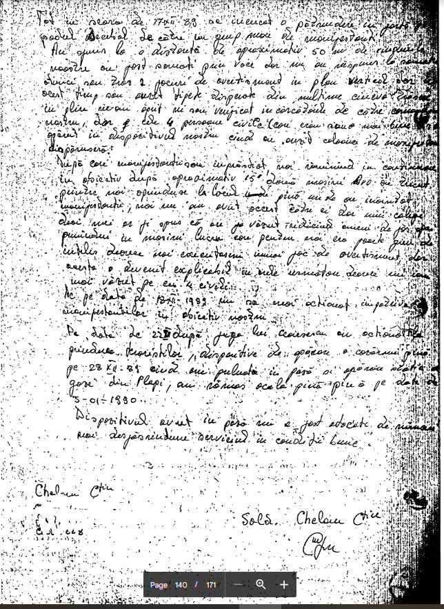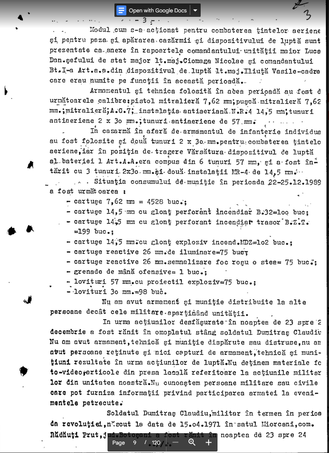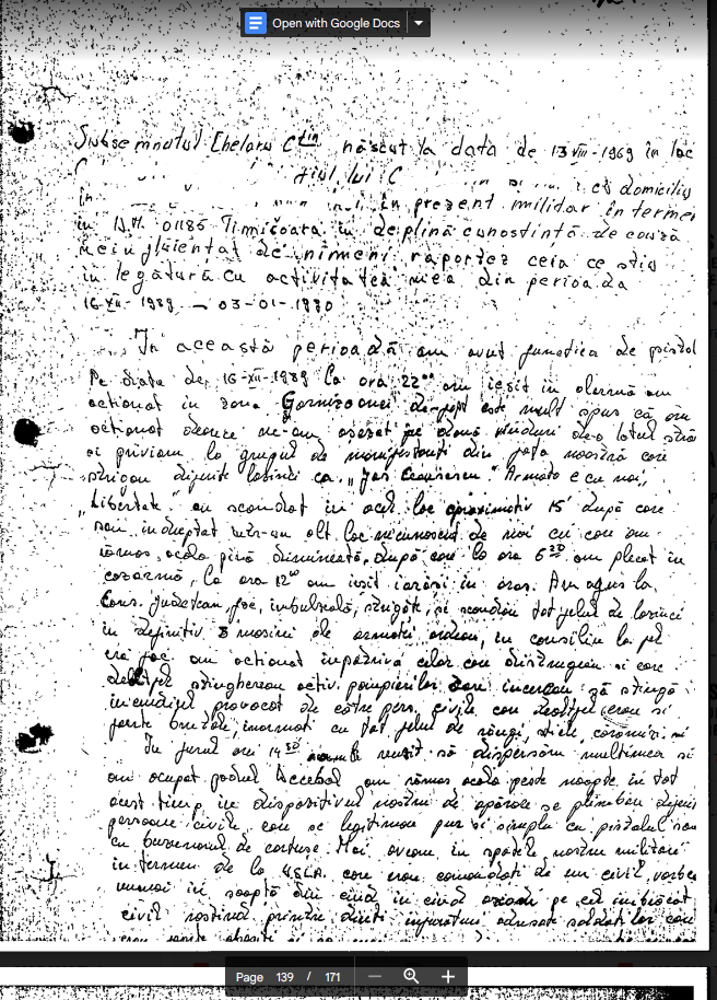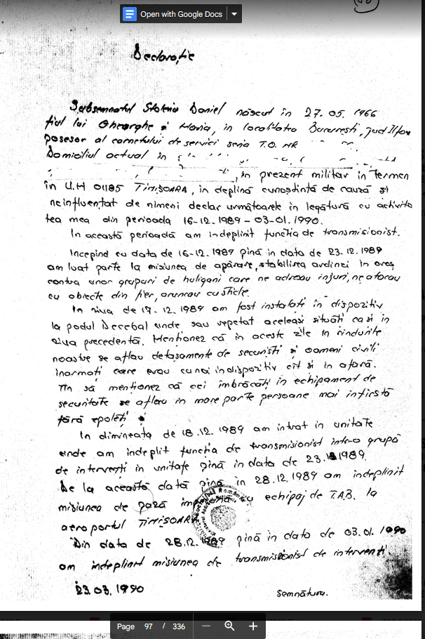 Dosarul Revolutiei. The Past is Coming (99). Declaratia lui Stolnicu Daniel (UM 01185 Timisoara, 23.03.1990): “In ziua de 17.12.1989 am fost instalati in dispozitiv la podul Decebal unde sau repetat aceleasi situati ca si in ziua precedenta. Mentionez ca in aceste zile in rindurile noastre se aflau detasamente de securisti si oameni civili inarmati care erau cu noi in dispozitiv cit si in afara. Tin sa mentionez ca cei imbracati in echipament de securitate se aflau in mare parte persoane mai in virsta fara epoleti.”