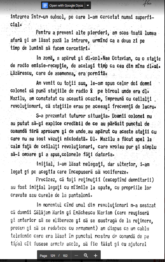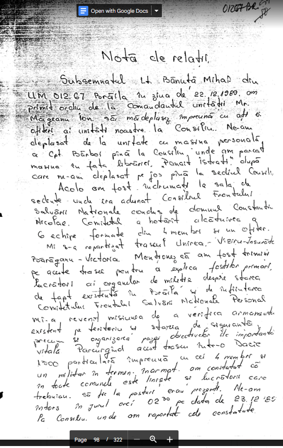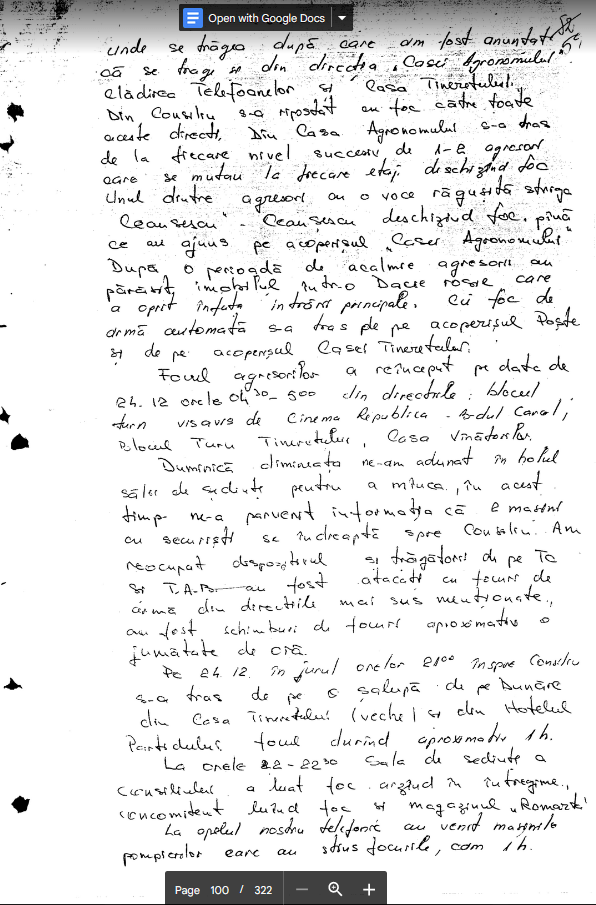La orele 1800 [23 dec.] (aproximativ) am fost interceptati cu foc de arma din urmatoarele puncte. Cladirea I.C.P.E.H., fostul Club al Tineretului (cladirea veche), Hotelul Partidului de la ultimul nivel…dupa care am fost anuntat ca se trage si din directia ,Casa Agronomului’ Cladirea Telefoanelor si Casa Tineretului. Din Consiliu s-a ripostat cu foc catre toate aceste directii. Din Casa Agronomului s-a tras de la fiecare nivel succesiv de 1-2 agresori care se mutau la fiecare etaj deschizind foc unul dintre agresori cu o voce ragusita striga Ceausescu-Ceausescu deschizind foc pina ce am ajuns pe acoprisul ,Casei Agronomului’