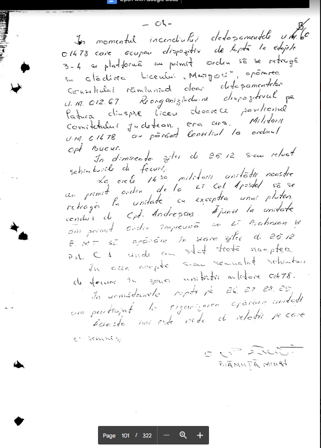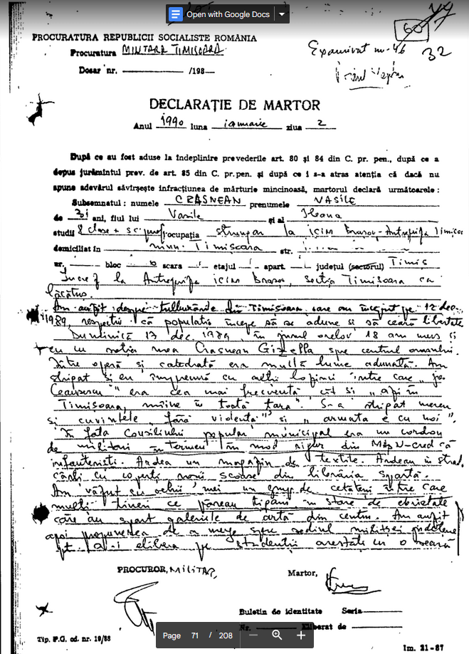In jurul 18.00…am vazut un cordon de militari care inaintau dinspre podul “Decebal” spre cinema “Parc”. In fata acestui cordon erau mai departe de militari, circa 4-5 persoane civile, imbracate in scurte civile cu gulere de blana. Precizez cu nu erau militari, erau persoane mai in virsta cu voce plina, cred ca era securisti. Unul a strigat de mai multe ori la noi sa intram in cladiri, ca se va trage asupra noastra. Cind am aprins lumina in hol, persoana respectiva a tras doua focuri de arma spre noi, timp in care eu si inca o femeie am fost ranite.