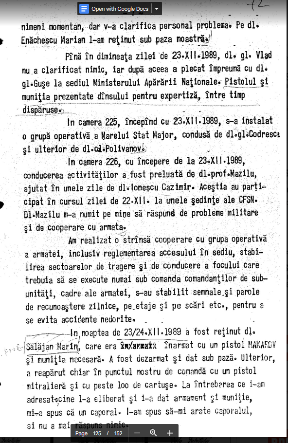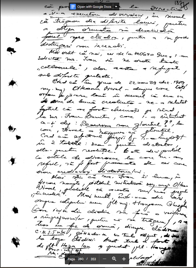 Dosarul Revolutiei. The Past is Coming (102). “CEAUSESCU SAU GLONTUL?”: Declaratia Plt. Major-ului Moldovan Constantin (UM 0690 Bucuresti, DSS M.A.E.), “Incepind cu 22 dec. 1989, dimineata, acest post de D5? s-a dublat, iar in ziua de 23 dec 1989–am sesizat prezenta de 17 de cadre de la Directia a V-a–sub comanda mr. Ivan Dumitru si mr. Opr? Cred ca in ziua de 22 sau 23 dec. 1989, srg, maj. Olteanu Viorel–despre care toti aveau o parare buna in sensul ca era un de buna credinta–ne-a relatat faputl ca au fost chemati pe rind, la mr. Ivan Dumitru, care l-a intrebat ca-si ?: Ceausescu sau glontul?”, la care, Viorel–raspuns ca glontul.”