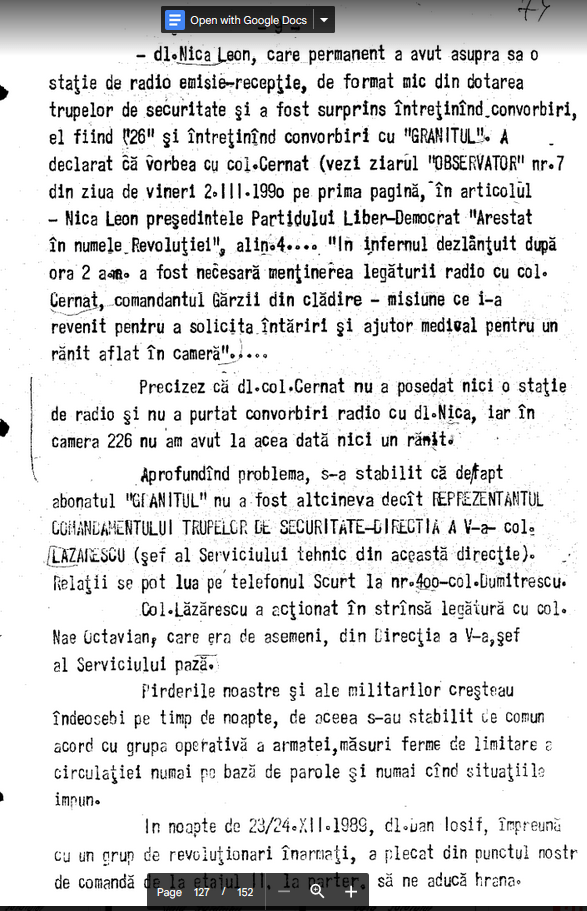 Dosarul Revolutiei. The Past is Coming (96). Extras din Declaratia Colonelului Radulescu Iordan (07.05.1990): (Iarasi cu Cazimir Ionescu, Nica Leon, si “GRANITUL.”) “Pentru a se pune capat macelului care continua sa se desfasoare, am rugat pe rind pe domnii Tudor Postelnicu, col. Lazarescu, col. Nae Octavian si pe Nica Leon sa transmita semnalul sau comanda de incetare a actiunilor si a tragerilor. Toti au refuzat categoric, spunind ca nu au nici o legatura cu aceste actiuni. Este semnificativ insa de retinut ca, dupa ce grupul format din acesti domni, a fost retinut si imobilizat precizia si intensitatea focului si a celorlalte actiuni executate impotriva acestui sediu, a noastra si a militarilor, s-a dimunat, iar incepind cu 25.XII.1989 (ei au fost predati pe data de 24.XII.1989 seara), tragerile se executau doar sporadic si fara eficienta.”