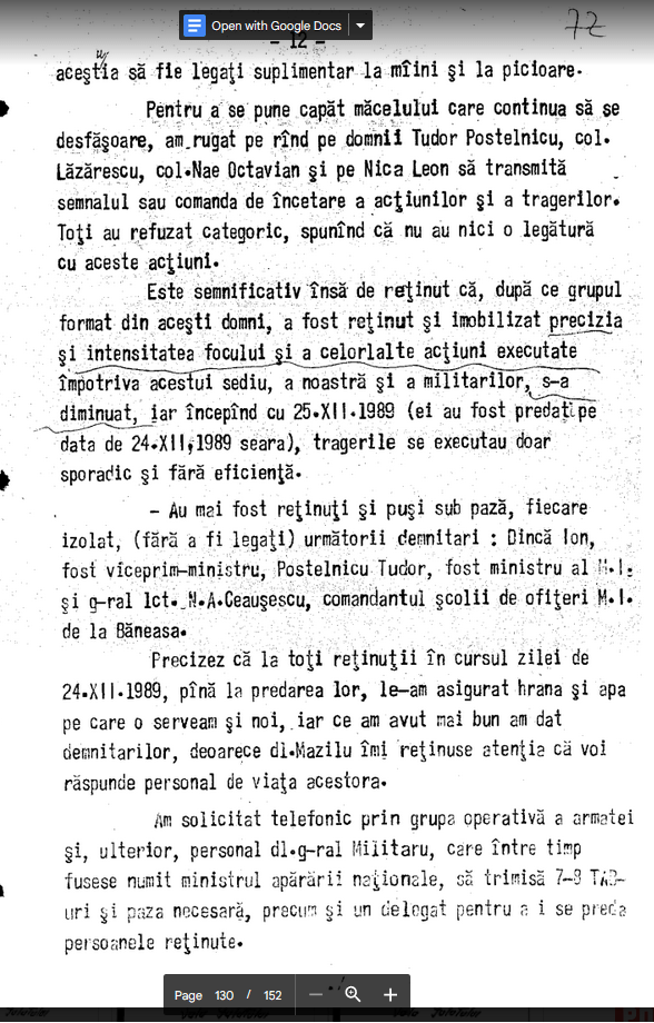 p. 130 “Pentru a se pune capat macelului care continua sa se desfasoare, am rugat pe rind pe domnii Tudor Postelnicu, col. Lazarescu, col. Nae Octavian si pe Nica Leon sa transmita semnalul sau comanda de incetare a actiunilor si a tragerilor. Toti au refuzat categoric, spunind ca nu au nici o legatura cu aceste actiuni. Este semnificativ insa de retinut ca, dupa ce grupul format din acesti domni, a fost retinut si imobilizat precizia si intensitatea focului si a celorlalte actiuni executate impotriva acestui sediu, a noastra si a militarilor, s-a dimunat, iar incepind cu 25.XII.1989 (ei au fost predati pe data de 24.XII.1989 seara), tragerile se executau doar sporadic si fara eficienta.”