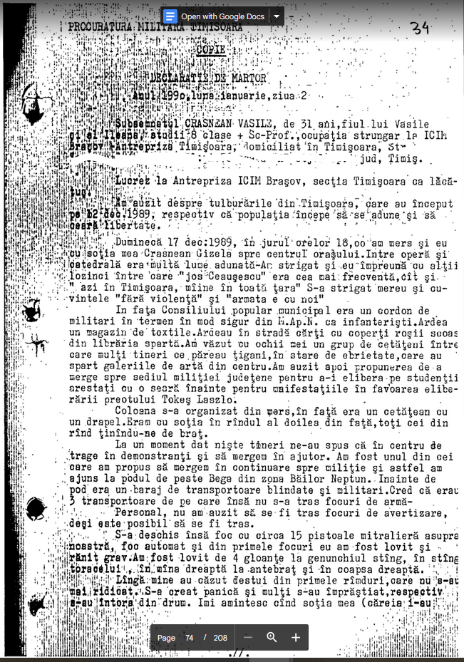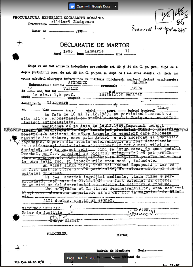 Dosarul Revolutiei. The Past is Coming (98). Declaratia lui Sindenco Marcel (muncitor, 11.01.1990): “…iar in cursul serii [17 dec.], cind se intunecase, in zona podului “Decebal” am fost impuscat in piciorul sting, fara sa pot preciza cine m-a impuscat. Din locul in care se tragea in parc nu se vedeau la gura tevii foc si impuscaturile erau seci, infundate. Am vazut linga mine inca doi oameni impuscati…”