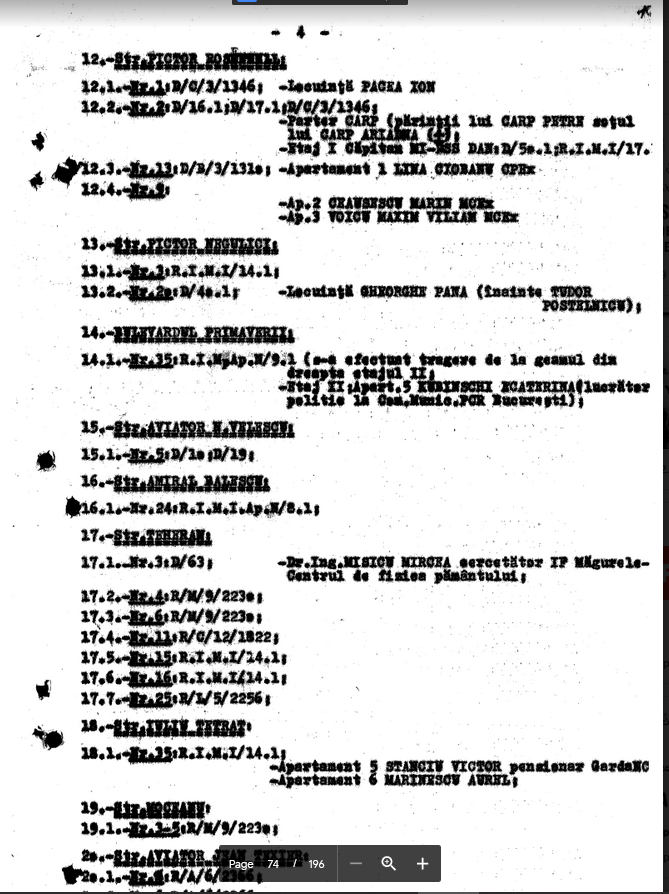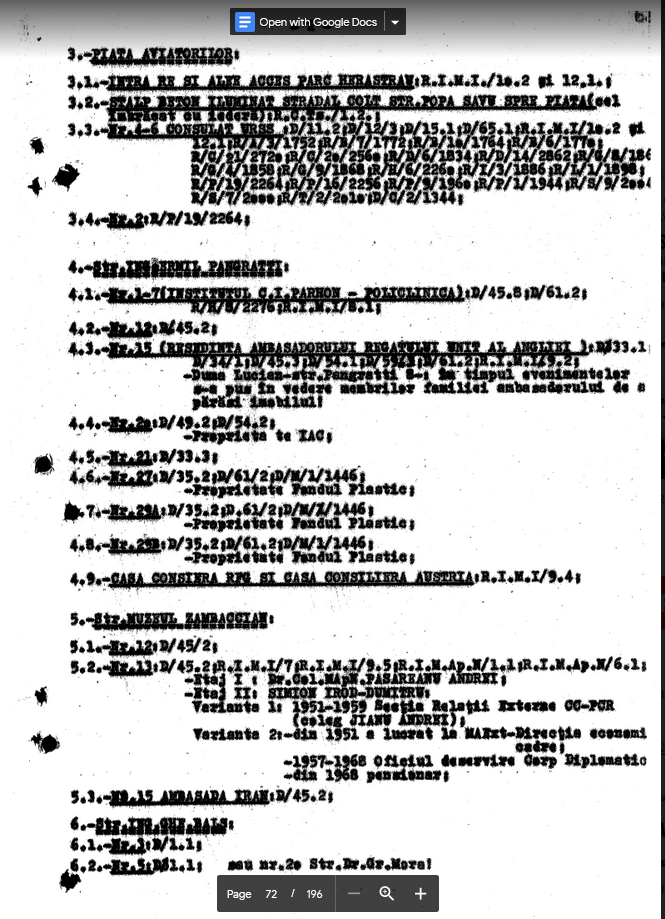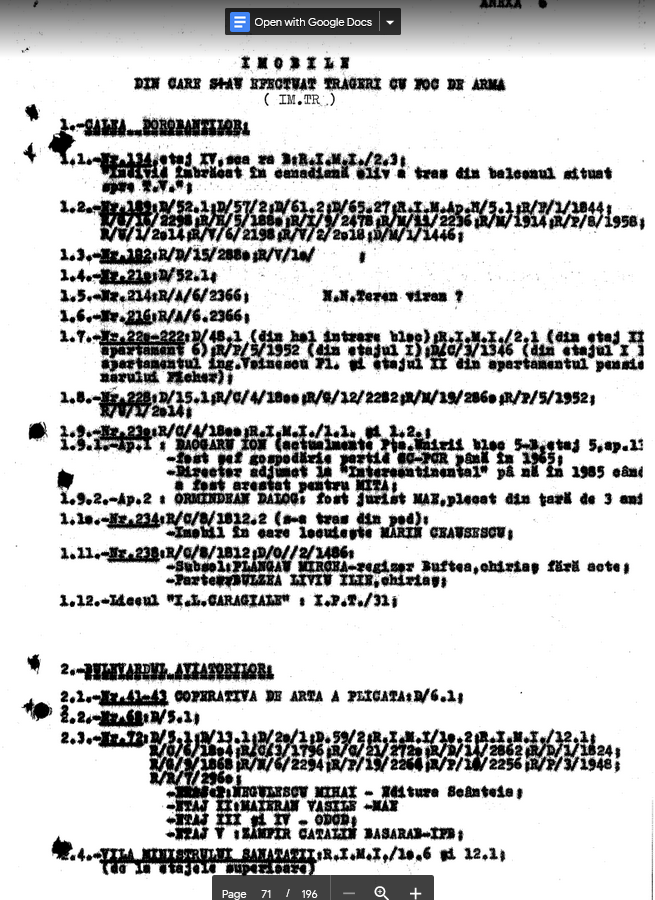 (TVR vol. 99 (SPM)–Raportul pentru subcomisie parlamentara despre decembrie 1989, Niculae Stefan Soucoup) was and is a roadmap, literally, for running to ground from where there was shooting toward the Television Station, who lived there, and in some cases who fired from there, who was captured there. In other words, Soucoup did the work of the military prosecutors, the work they failed to do. (It is hard to read, but it could still be useful.) Oh, yeah, sure, who lived in these houses and buildings, in the neighborhood dominated by the Ceausescus, important communist party members and nomenklaturists, higher ups of the Interior Ministry and Securitate? It is only the Securitate’s 32 years of disinformation and revisionism that makes it hard for Romanians, and sadly many Romanianists abroad, to answer that question.