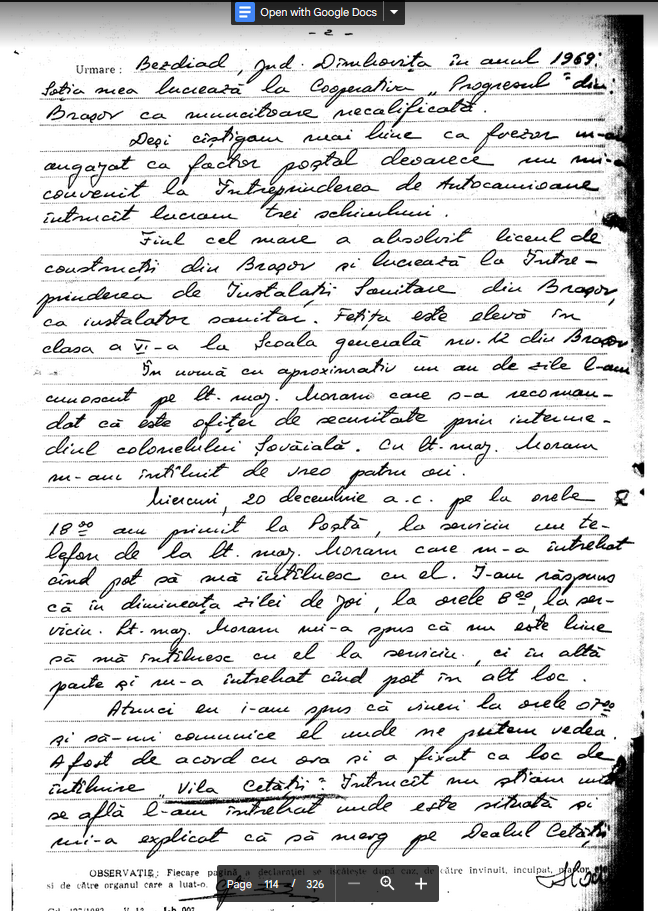 Pe strada respectiva ne-am intilnit cu doi sau trei barbati civili, tineri are coborau spre oras. I-am oprit, i-am legitimat, unul din ei avea un tatuaj cu sotii Ceausescu, aveau o atitudine recalcitranta si intrucat veneanu din directia Tampa de unde se tragea, i-am retinut…
