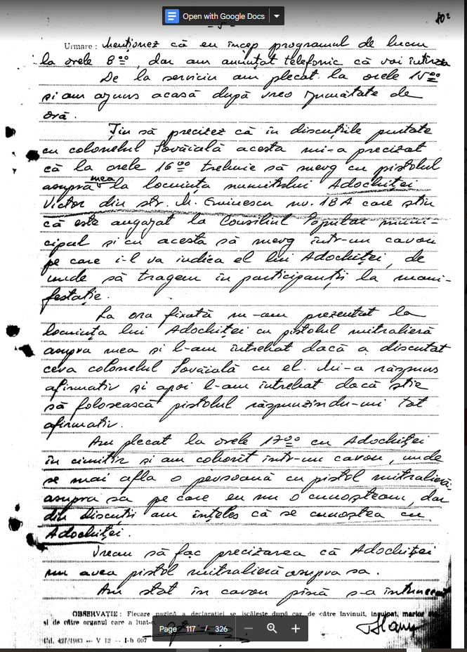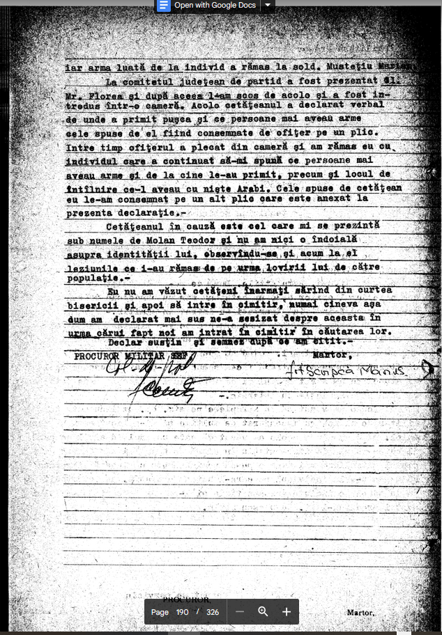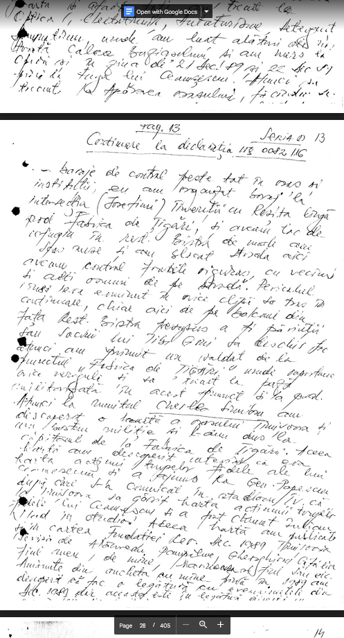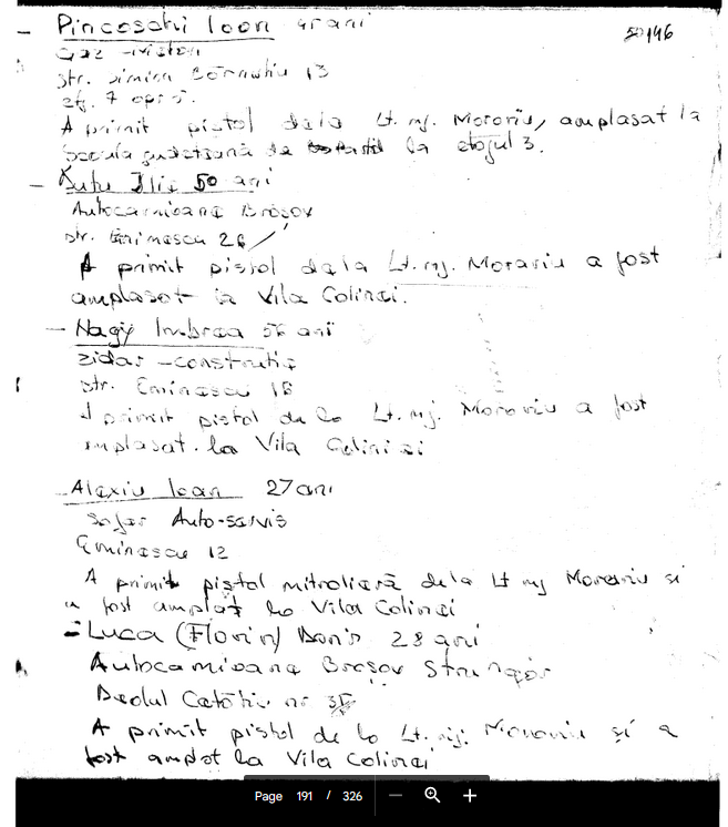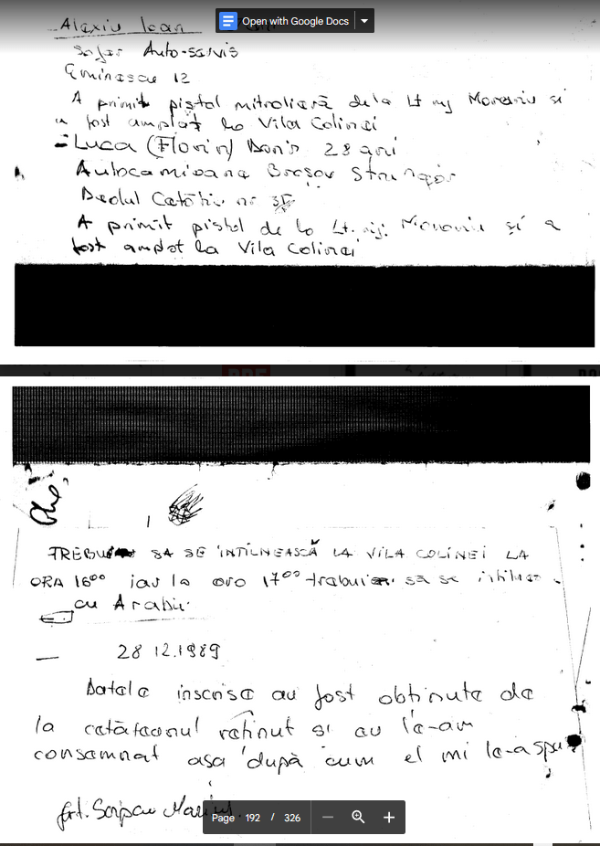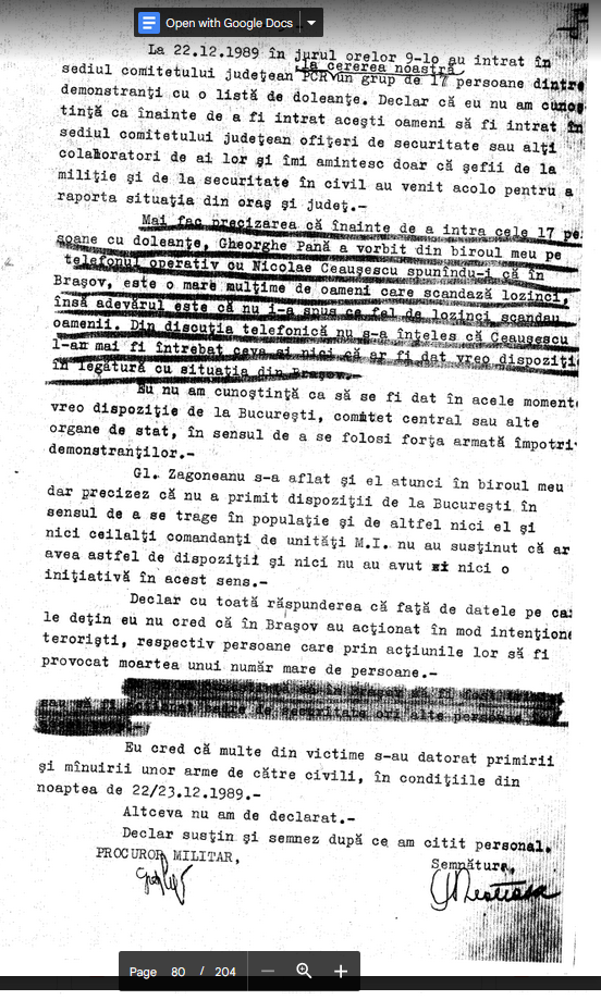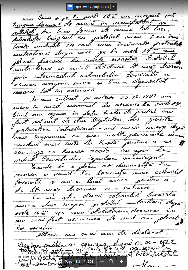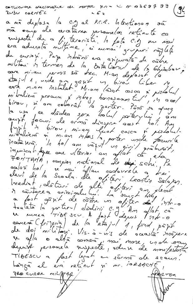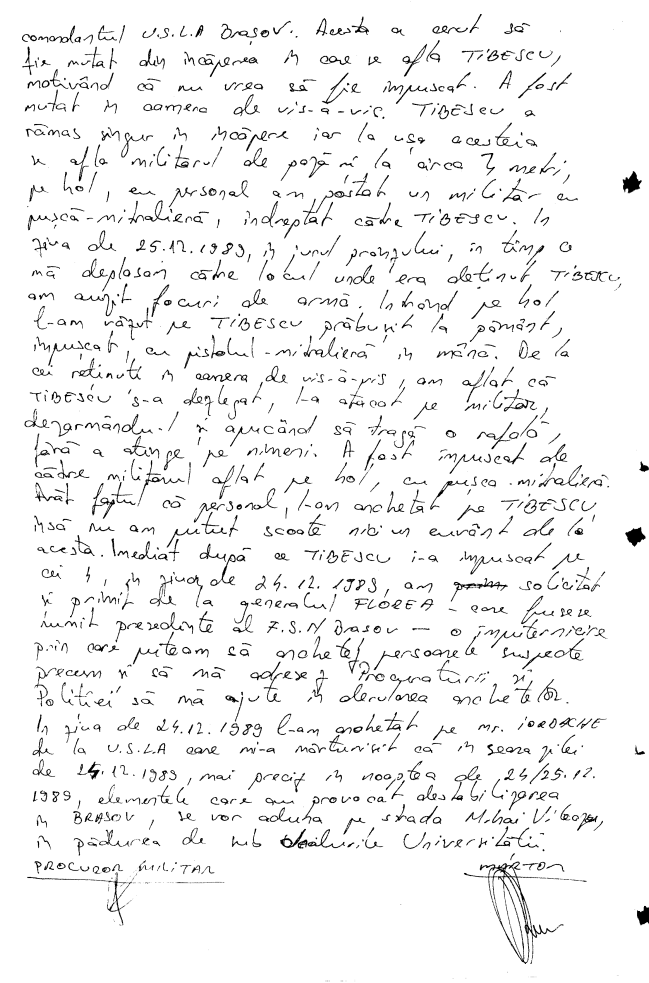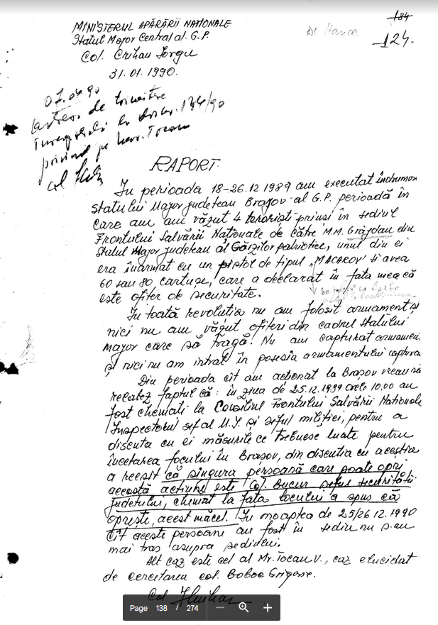“In perioada 18-26.12 1989 am executat ? Statul Major judetean Brasov al G.P. perioada in care am vazut 4 teroristi prinsi in sediul Frontul Salvarii Nationale de catre M.M. Grajdan din SMJ G.P., unul din ei era inarmat cu un pistol de tipul ,MACAROV’ si avea 60 sau 80 cartuse, care a declarat in fata mea ca este ofiter de securitate.”