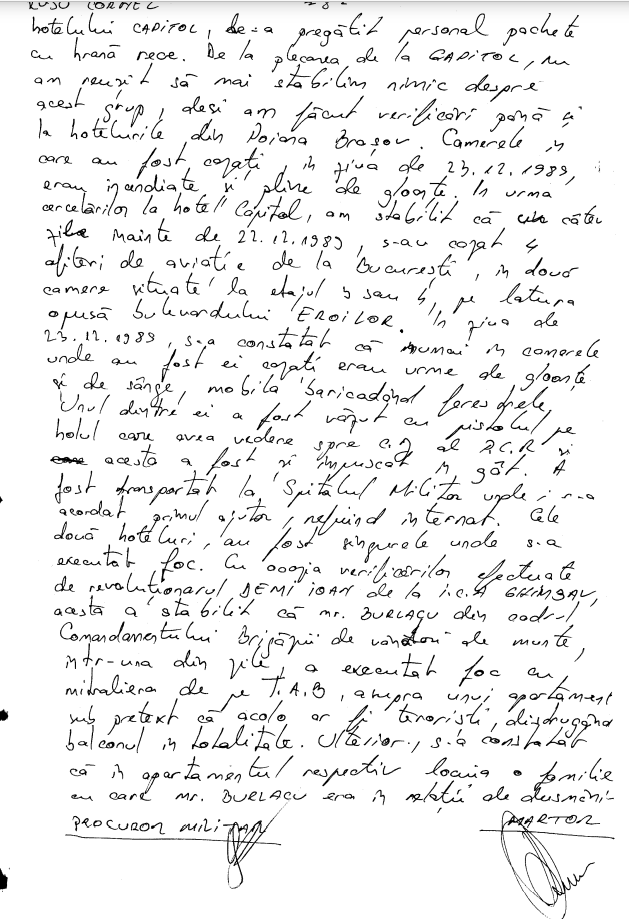 “…in ziua de 25.12.1989 orele 1000 au fost chemati la Consiliul Frontului Salvarii Nationale Inspectorul sef al M.I. si seful militiei, pentru a discuta cu ei masurile ce trebuiesc luate pentru incetarea focului in Brasov, din discutia cu acestia a reiesit ca singura persoana care poate opri aceasta actiune este Col. Bucur seful securitatii judetului, chemat la fata locului a spus ca opreste, acest macel. In noaptea de 25/26 12.1990 [sic.] cit aceste persoane au fost in sediu nu s-au mai tras asupra sediului….”