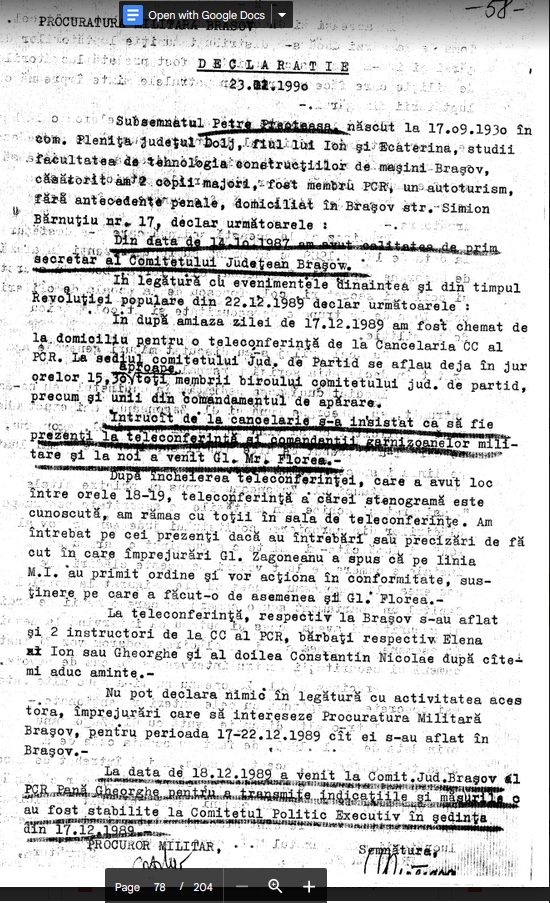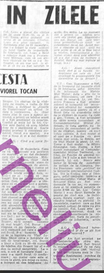 “‘Domnule colonel, noi nu te intrebam daca poti s-o faci, noi te intrebam daca vrei sa opresti macelul in Brasov, s-ti opresti oamenii sa mai traga.’ Col Bucur [Seful Securitatii] i-a raspuns ca nu depinde de el, sa-i opreasca cel care a declansat focul. S-a incercat atunci sa se ia legatura cu Vlad Iulian. Dupa circa o jumatate de ora de tergiversari, col. Bucur a lasat o lista cu 50-60 numere de telefon din Brasov iar el s-a dus la sediul securitatii. La o ora, o ora si jumatate dupa aceea s-a oprit focul. O confirmare: un maior care este si acum la garzi, era coleg cu mine, a inceput sa dea telefoane de acolo, din sediu. La un moment dat a primit un telfon prin care era cautat gen. Zagoneanu [Sef Inspectoratului M.I.] sau col. Bucur, cel care telefona prezentindu-se drept un subordonat de al lor. Acest maior a raspuns ca nici ? era acolo ? si ca ? ? ? la telefon. Interlocutorul ? a intrebat atunci daca este adevarat (?) ca s-a dat ordin de incetare a focului, daca nu mai trebuie sa traga.”