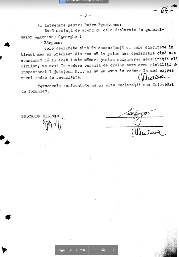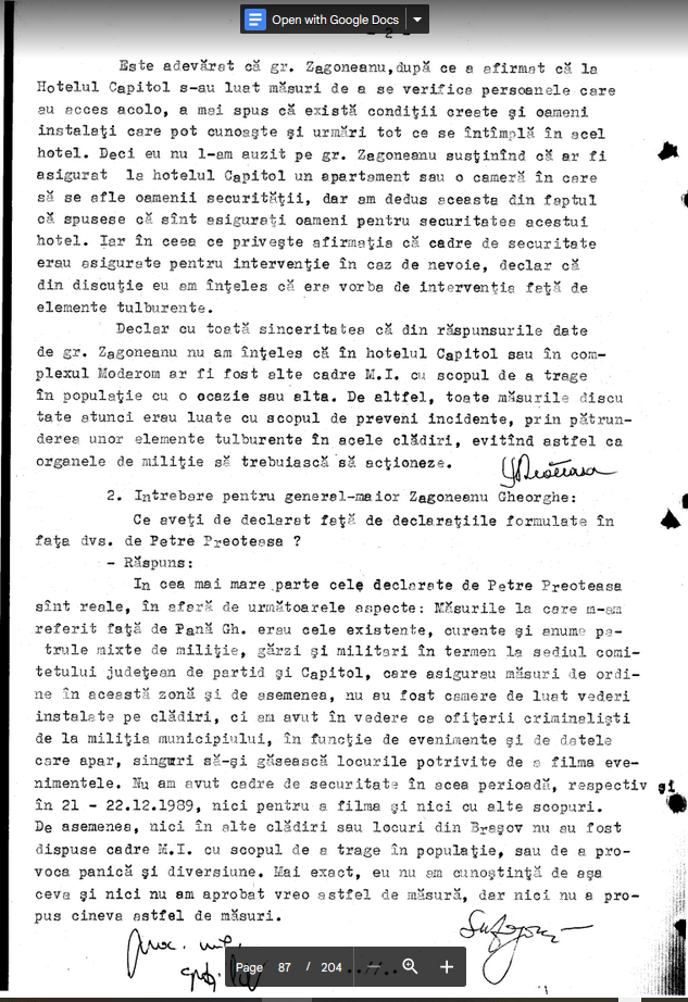 Cele declarate in concordanta cu cele discutate in biroul meu si precizez din nou ca la prima mea declaratie cind s-a consemnat ca au fost luate masuri pentru asiugrarea securitatii cladirilor, am avut in vedere oamenii de ordine care erau stabiliti de inspectoratul judetean M.I. si nu am avut in vedere in mod expres numai cadre de securitate.