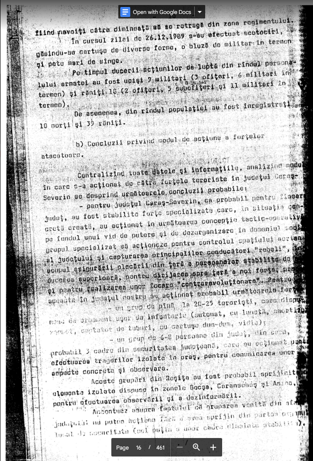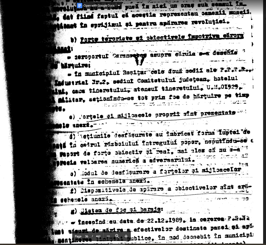 pentru judetul Caras-Severin, ca probabil pentru fiecare judet, au fost stabilite forte specializate care, in situatia concreta creata, au actionat in urmatoarea conceptie tactic-operativa pe fondul unui vid de putere si de dezorganizare in domneiul social cu? grupul specializat sa actioneze pentru controlul spatiului aerian al judetului si capturarea principalilor conducatori ‘rebeli’, cu scopul asiguararii plecarii din tara a persoanelor stabilite de conducerea superioara, pentru dirijarea spre tara a noi forte, ” si pentru realizarea unor focare ‘contrarevolutionara’…Pentru aceasta in judetul nostru au actionat probabil urmatoarele forte: