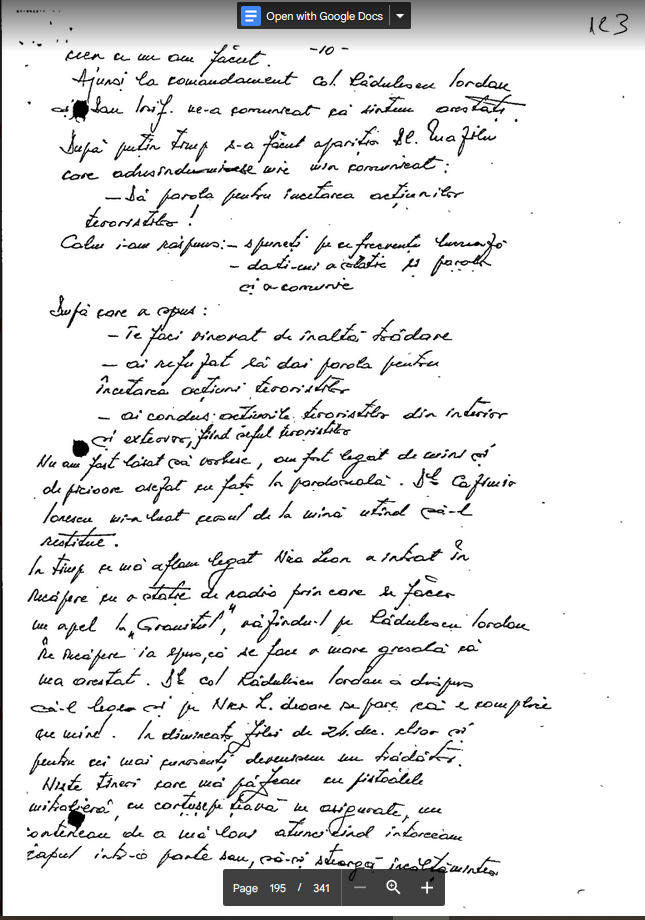 “Ajuns la comandament col. Radulescu Iordan si Dan Iosif ne-a comunicat ca sintem arestati. Dupa putin timp s-a facut aparitia Dl. Mazilu care adusindu-mi-se mie un comunicat: –Da parola pentru incetarea actiunilor teroristilor!…Dupa care a spus ai condus actiunilor teroristilor din interior si exterior, fiind seful teroristilor….”
