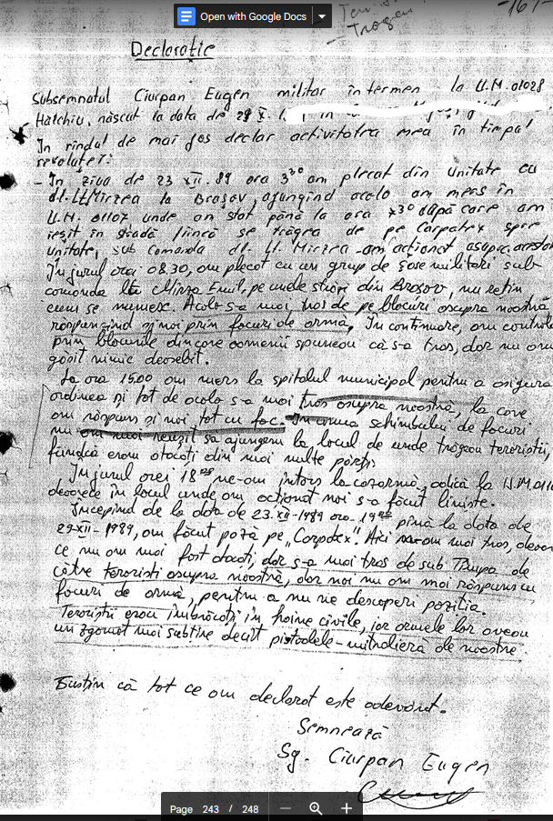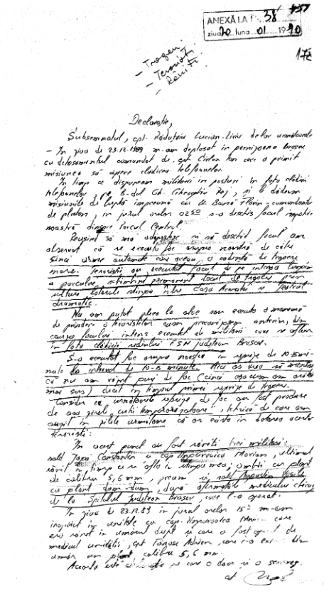 “…In acea noapte [21.12.1989] m-am intilnit cu un fost coleg de liceu care lucra la Securitate pe nume Motoran Constantin. Acesta era in civil si mi-a spus ca zona este impanzita de organele de securitate, militie, sa ma feresc [de] constructiile inalte si ca ar fi mai bine sa merg acasa…In noaptea de 23/24.12.89…cu un grup de necunoscuti am mers la liceul Unirea si am verificat interiorul. Aici am gasit combinezoane negre si tuburi de cartuse, dar si urme de sange in preajma canceleriei.”