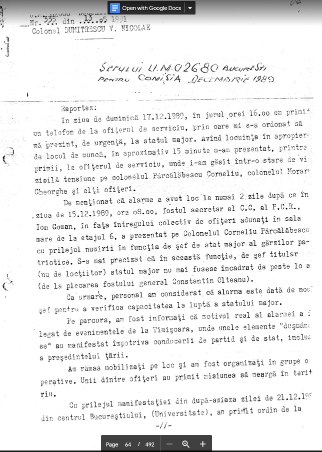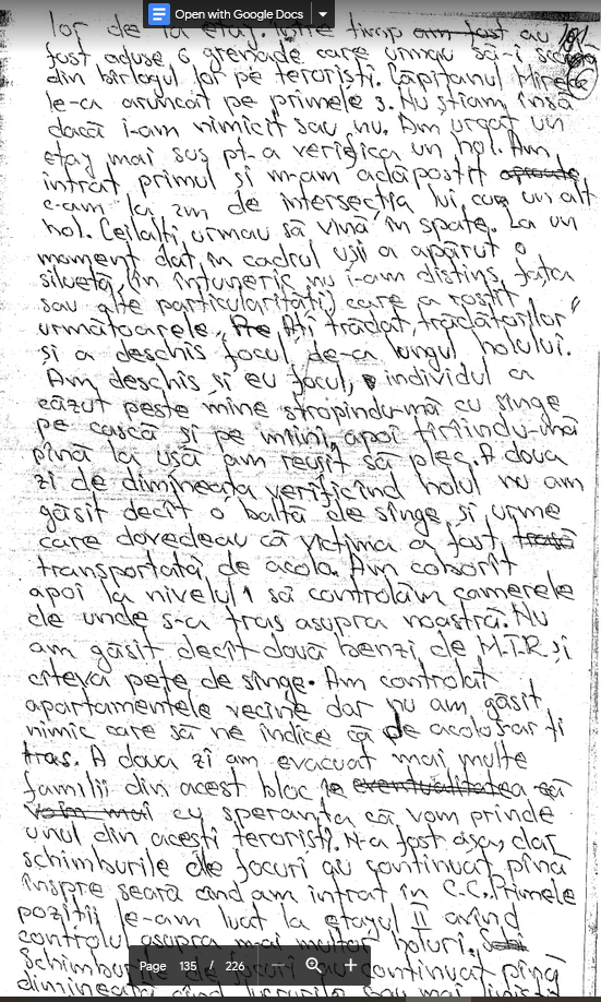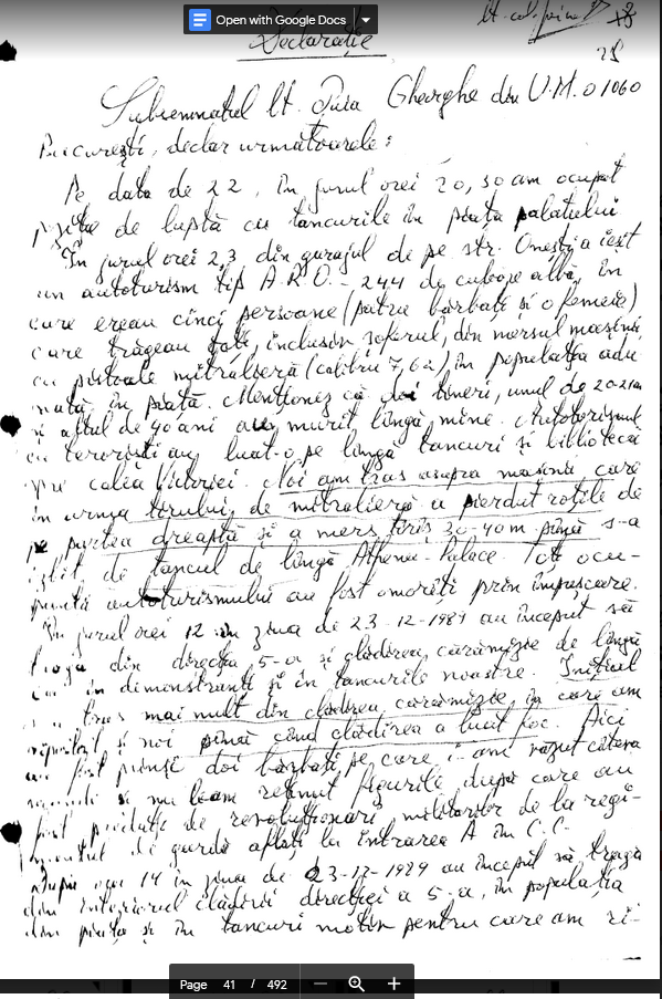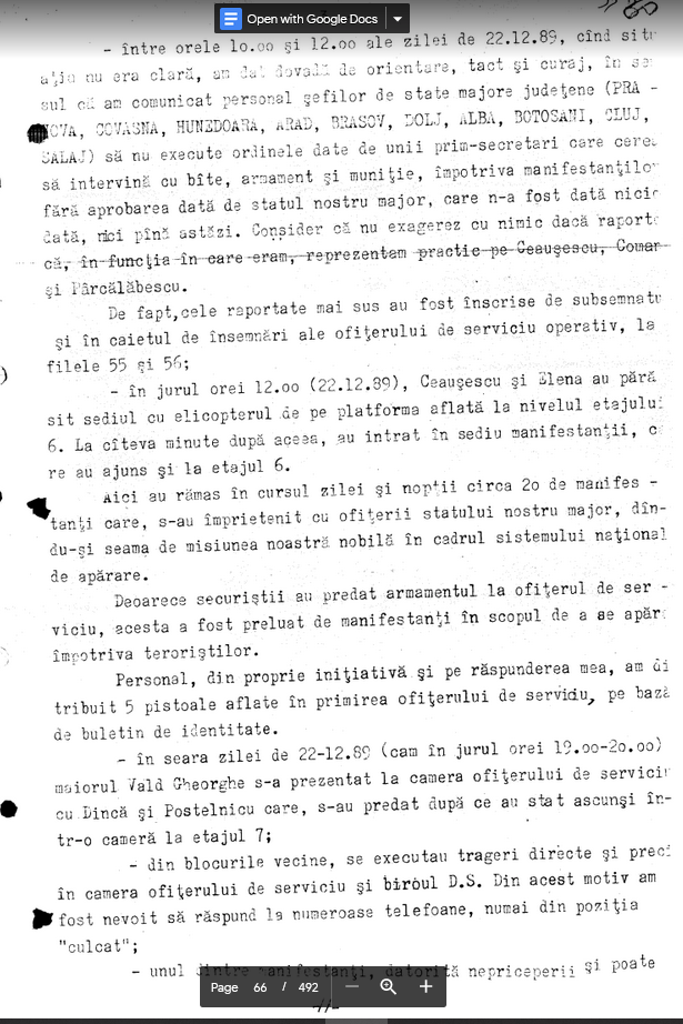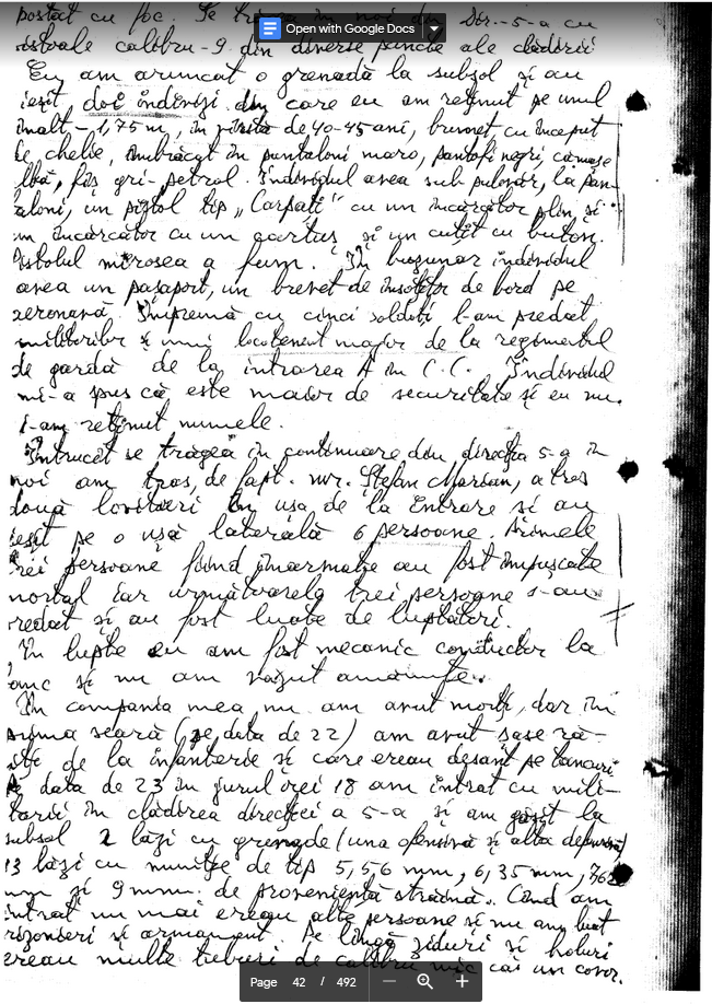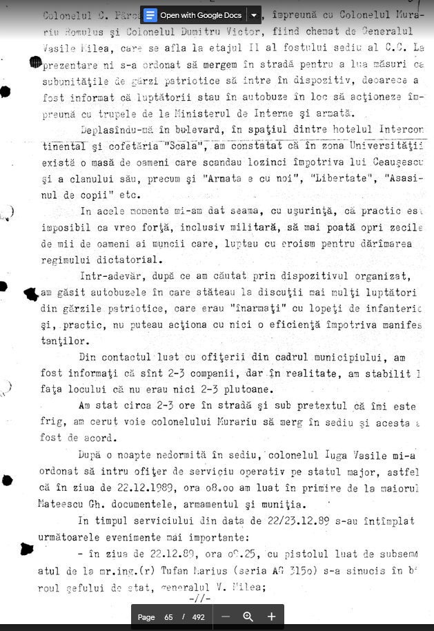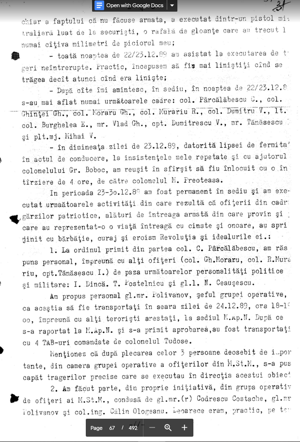 Din Directia a V-a, din depozitul de munitie, au fost scoase pe 23-24 decembrie 1989 cartuse DUM-DUM, cartuse speciale care nu se potriveau la nici o arma din dotarea M.Ap.N. S-au gasit trei-patru cutii cu astfel de cartuse. Gloantele speciale, erau lungi de 5-6 cm si putin mai groasa decit un creion. Un astfel de cartus avea in virf o piatra alba, transparenta. Toate aceste cartuse i le-am prezentat personal, spre a fi filmate, d-lui Spiru Zeres. Toate cartusele speciale, in afara de DUM-DUM era de provenienta RFG-ista. Din Directia a V-a au fost predate U.M. 01305. Capitan doctor Panait, care a spus ca pina atunci nu vazuse astel de munitie, maior Puiu si captian Visinescu stiu de ele.